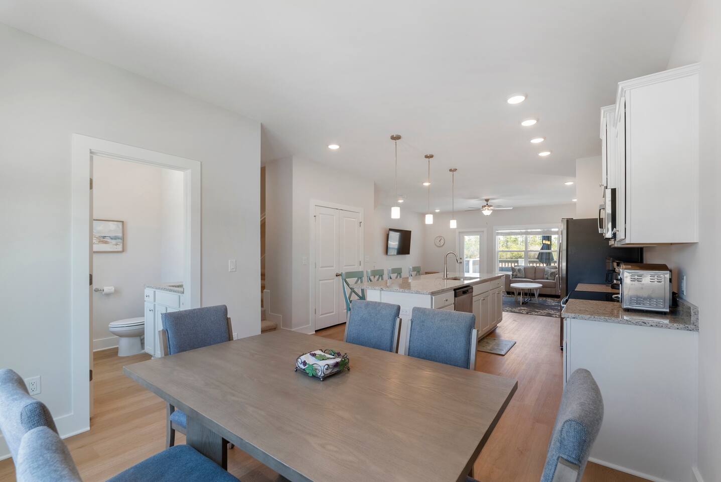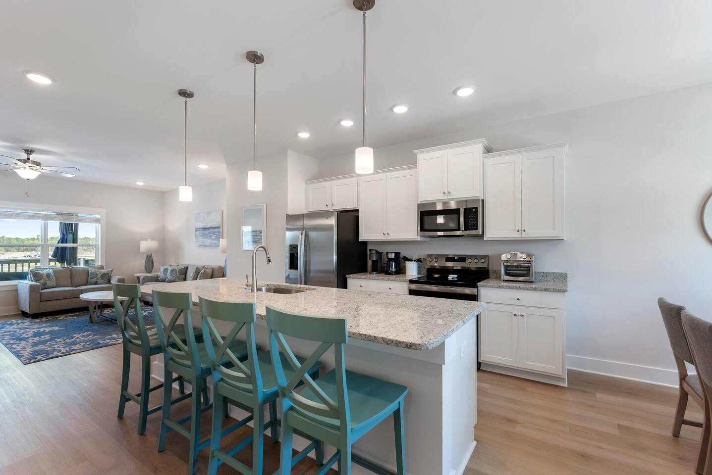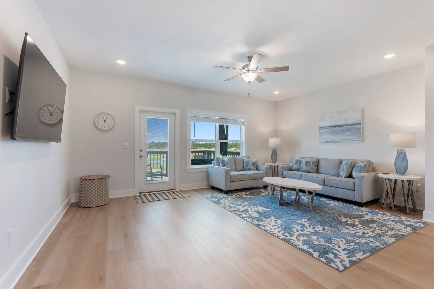 The charming Panama City Beach house is designed to provide a comfortable getaway for all visitors seeking the perfect stay. Its modern setting and outstanding facilities will offer the levels of relaxation and convenience you are looking for in a vacation home. Each room has an abundance of amenities and beautiful furnishings, enriched by plenty of natural light that accentuates the bright floors and tastefully chosen decor. Every inch of space is well-used, which is best visible in the entertaining and cozy open-concept living room, which successfully combines the living area with the lovely dining space and the fully equipped kitchen. Three highly comfortable bedrooms will provide all the relaxation you need after a thrilling day at the sandy beach. Youβll be able to catch a breath of fresh air in the backyard. We recommend lounging on the front porch if youβd like to get a feel for the tranquil neighborhood. β LIVING ROOM β The living room is perfect for enjoying fun and memorable moments after an eventful day. Find your spot on the comfy sofa, grab some snacks and drinks, and enjoy watching TV with your family and friends. β Comfortable Sofas with Pillows β 65β Smart TV β Stylish Coffee Table β Reading Lamp β KITCHEN & DINING β Come to the fully equipped kitchen and use its many modern cooking appliances, spacious quartz countertops, and ample cabinetry to create tasty homemade meals worthy of the most praised restaurants. β Microwave β Stove β Oven β Toaster β Blender β Refrigerator/Freezer β Dishwasher β Two Coffee Makers β Sink - Hot & Cold Water β Glasses β Silverware β Pots & Pans Enjoy a refreshing drink in the backyard while the designated family chef works their magic in the kitchen. The smells will invite you to the dining table for a tasty, homemade meal. β Dining Table with Seating for 6 β Kitchen Island with Seating for 4 β Access to the Balcony β SLEEPING ARRANGEMENTS - 3 BEDROOMS β You can retreat to these comfortable bedrooms, designed and furnished, to give you all the rest needed after a day of adventuring throughout Panama City Beach and the community. β Master Bedroom: Queen-Size Bed, Ensuite Bathroom β Bedroom 2: Queen-Size Bed β Bedroom 3: Bunk Bed (Twin over full and pull-out twin) β Premium Pillows, Linens, and Sheets β Smart TVs β Closets with Hangers and Shelves β Nightstands with Reading Lamps β BATHROOMS β In addition to the ensuite bathroom of the master bedroom, the home offers another full, relaxing bathroom stocked with essential toiletries and fresh towels for maximum comfort and convenience. β Walk-In Shower β Vanity (Double in the Master Bath) β Mirror β Toilet β Towels β Hair Dryer β Essential Toiletries β OUTDOOR AREAS β Patio on the first floor and a balcony on the second floor. You can look no further than our charming home for your memorable visit to Panama City Beach, FL. We look forward to you experiencing its complete comfort and coziness.