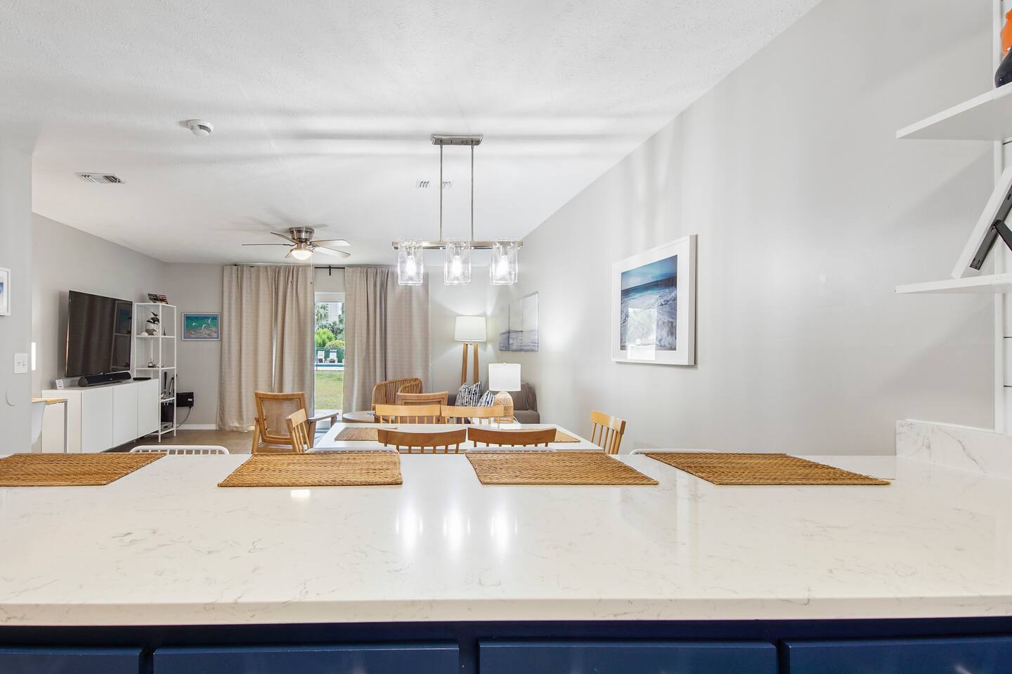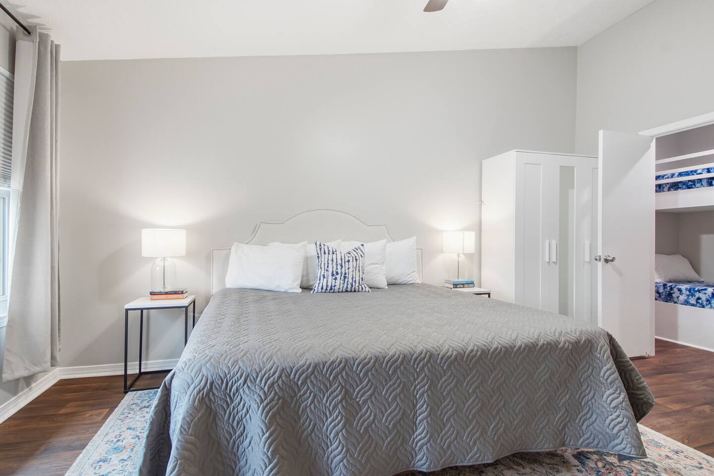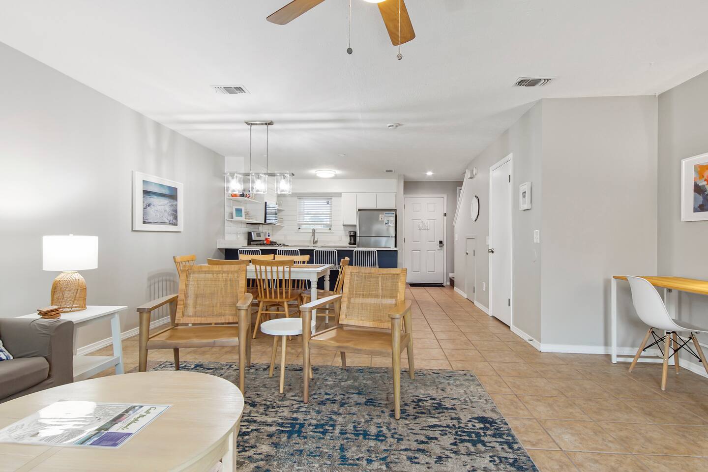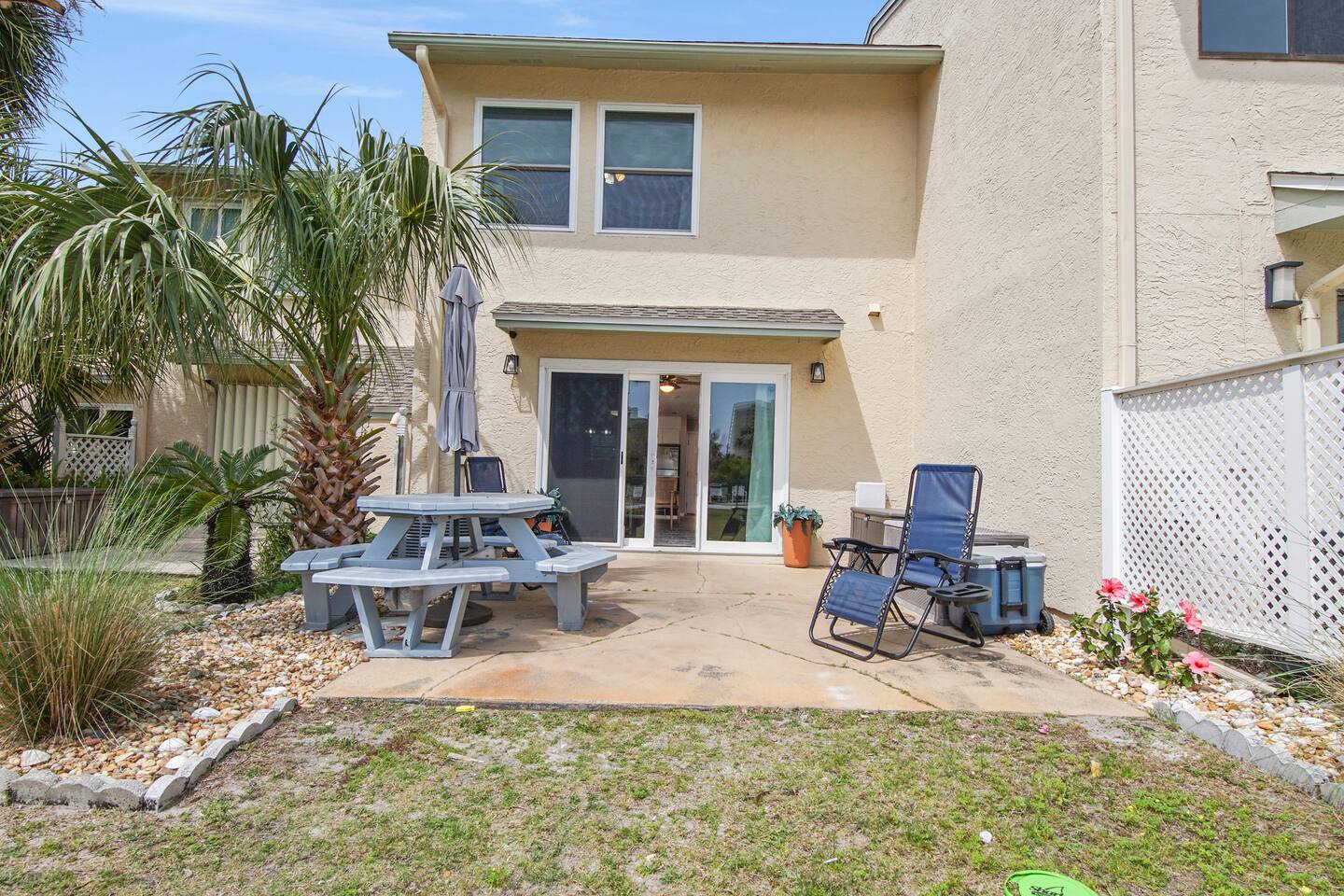 There are security cameras by the front door and back patio, for our and guests' safety. This lovely two-story Panama City Beach gem is designed with ultimate relaxation and resort-like comforts in mind. Invite everyone to the open-concept living area boasting a modern look and have hours of fun by watching movies, playing games, or cooking in the kitchen. Serve those tasty homemade delicacies on the dining table, creating a pleasant setting you’ll enjoy in the great company of your family and friends. Open the patio doors to reveal the private outdoor area, revel in complete tranquility, and feel the pulse of the wonderful resort. Have a refreshing drink and catch a breath of fresh air before heading to the beach or the nearby swimming pools. Once the sun goes down in Florida, retreat to the upper floor, which features two inviting bedrooms with comfortable beds to help you recharge after a long day of Panama City adventures. ★ LIVING AREA ★ The bright living room is the heartbeat of the open-concept design area, offering a unique and upbeat setting to relax between exciting sightseeing and beach hopping. ✔ Couch ✔ Smart TV ✔ Stylish Coffee Table ✔ Reading Lamp ✔ Access to the Patio ★ KITCHEN & DINING ★ Open the cabinetry to find everything you need to treat your family to their favorite meals. Sort those fresh ingredients on the countertops and use the modern cooking appliances to unleash your cooking creativity! ✔ Microwave ✔ Stove ✔ Oven ✔ Toaster ✔ Blender ✔ Coffee Maker (Keurig Machine, Drip Coffee Maker) ✔ Refrigerator/Freezer ✔ Dishwasher ✔ Sink - Hot & Cold Water ✔ Glasses ✔ Silverware ✔ Pots & Pans The dining table is ideally nestled by the kitchen, allowing you to set the table and enjoy tasty family meals easily. The kitchen features a lovely bar where you can serve breakfasts, snacks, and smaller meals. ✔ Dining Table with Seating for 6 ✔ Kitchen Bar with Seating for 3 ★ SLEEPING ARRANGEMENTS - 2 BEDROOMS ★ Explore Panama City Beach, visit the attractions, soak up the sun on the beach, and then retreat to two comfortable bedrooms to rest so you can do it all again tomorrow. ♛ Bedroom 1: King-size bed, Twin over Twin bunk bed ♛ Bedroom 2: King-Size Bed Both bedrooms come with a similar set of amenities: ✔ Premium Pillows, Linens, and Sheets ✔ Smart TVs ✔ Closets with Hangers and Shelves ✔ Dressers with Spacious Drawers ✔ Nightstands with Reading Lamps ★ BATHROOMS ★ To ensure a perfect, carefree stay, we have prepared essential toiletries and fresh towels in the inviting full bathrooms on the upper floor and the convenient half bath accessible from the living area. ✔ Vanity ✔ Mirror ✔ Toilet ✔ Towels ✔ Hair Dryer ✔ Essential Toiletries ★ OUTDOORS ★ Marvel at the serene surroundings from the two patios offering many relaxing spaces and amenities. ✔ Back Patio with Lounge Seating Look no further than our charming resort home for an unforgettable visit to Panama City Beach, FL. We are happy to answer any questions you might have.