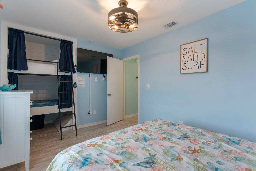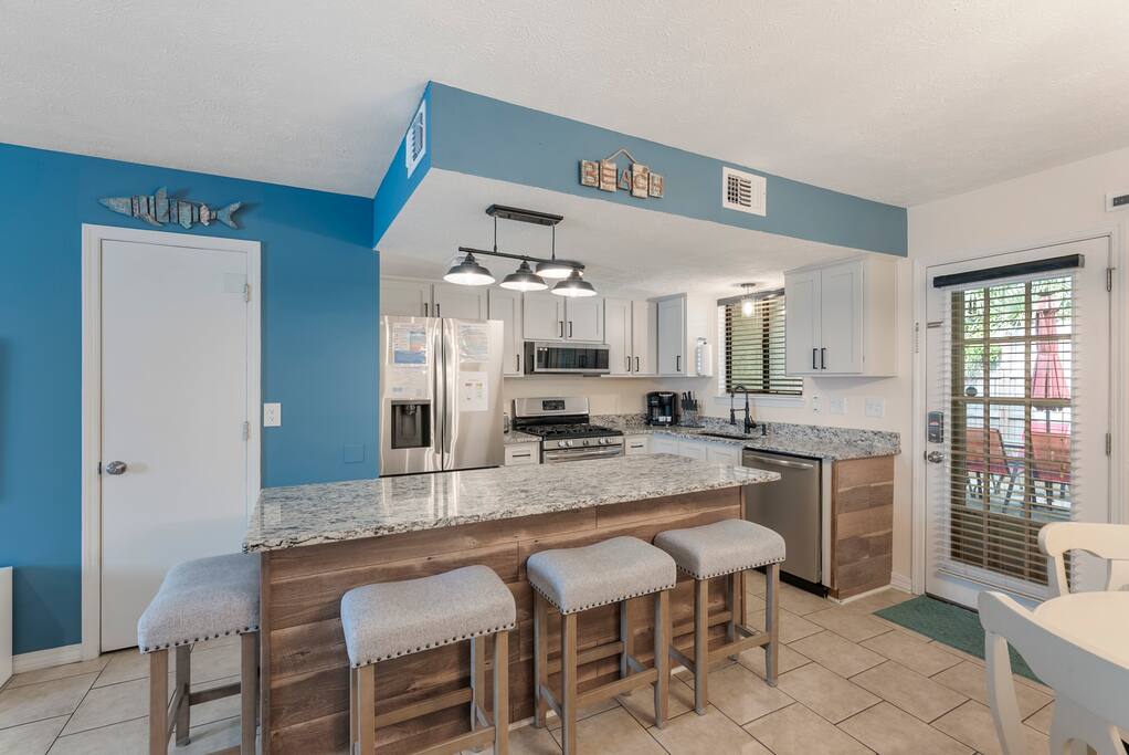 This lovely two-story Panama City Beach gem is designed with ultimate relaxation and resort-like comforts in mind. Invite everyone to the open-concept living area boasting a beachy look and have hours of fun by watching movies, playing games, or cooking in the kitchen. Serve those tasty homemade delicacies on the dining table, creating a pleasant setting you’ll enjoy in the great company of your family and friends. Open the patio doors to reveal the private outdoor area, revel in complete tranquility, and feel the pulse of the wonderful resort. Have a refreshing drink and catch a breath of fresh air before heading to the beach or the nearby swimming pools. Once the sun goes down in Florida, retreat to the upper floor, which features two inviting bedrooms with comfortable beds to help you recharge after a long day of Panama City adventures. ★ LIVING AREA ★ The bright living room is the heartbeat of the open-concept design area, offering a unique and upbeat setting to relax between exciting sightseeing and beach hopping. ✔ Smart TV ✔ Coffee Table ✔ Reading Lamp ✔ Access to the Patio ★ KITCHEN & DINING ★ Open the cabinetry to find everything you need to treat your family to their favorite meals. Sort those fresh ingredients on the countertops and use the modern cooking appliances to unleash your cooking creativity! ✔ Microwave ✔ Stove ✔ Oven ✔ Toaster ✔ Blender ✔ Coffee Maker (Keurig Machine, Drip Coffee Maker) ✔ Refrigerator/Freezer ✔ Dishwasher ✔ Sink - Hot & Cold Water ✔ Glasses ✔ Silverware ✔ Pots & Pans The dining table is ideally nestled by the kitchen, allowing you to set the table and enjoy tasty family meals easily. The kitchen features a lovely bar where you can serve breakfasts, snacks, and smaller meals. ✔ Dining Table with Seating for 4 ✔ Kitchen Bar with Seating ★ SLEEPING ARRANGEMENTS - 2 BEDROOMS ★ Explore Panama City Beach, visit the attractions, soak up the sun on the beach, and then retreat to two comfortable bedrooms to rest so you can do it all again tomorrow. ♛ Bedroom 1: King-Size Bed ♛ Bedroom 2: One Queen-Size Bed and Twin over Twin bunkbed Both bedrooms come with a similar set of amenities: ✔ Pillows, Linens, and Sheets ✔ Smart TVs ✔ Closets with Hangers and Shelves ✔ Dressers with Spacious Drawers ✔ Nightstands with Reading Lamps ★ BATHROOMS ★ To ensure a perfect, carefree stay, we have prepared essential toiletries and fresh towels in the inviting full bathrooms on the upper floor and the convenient half bath accessible from the living area. ✔ Walk-In Shower ✔ Vanity ✔ Mirror ✔ Toilet ✔ Towels ✔ Hair Dryer ✔ Essential Toiletries ★ OUTDOORS ★ Marvel at the serene surroundings from the two patios offering many relaxing spaces and amenities. Look no further than our charming resort home for an unforgettable visit to Panama City Beach, FL. We are happy to answer any questions you might have.